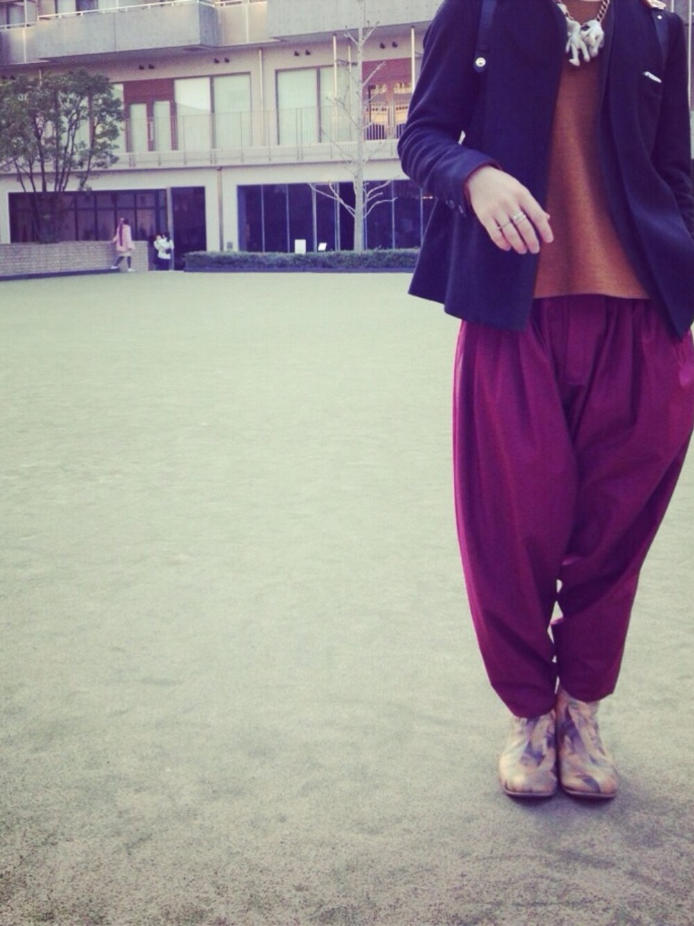 ka na taのジャケット、インナー。 YANTRのパンツ。 ohtaのブーツ。 1984のスカーフ。 Marniのドールネックレス。 s.nakaba