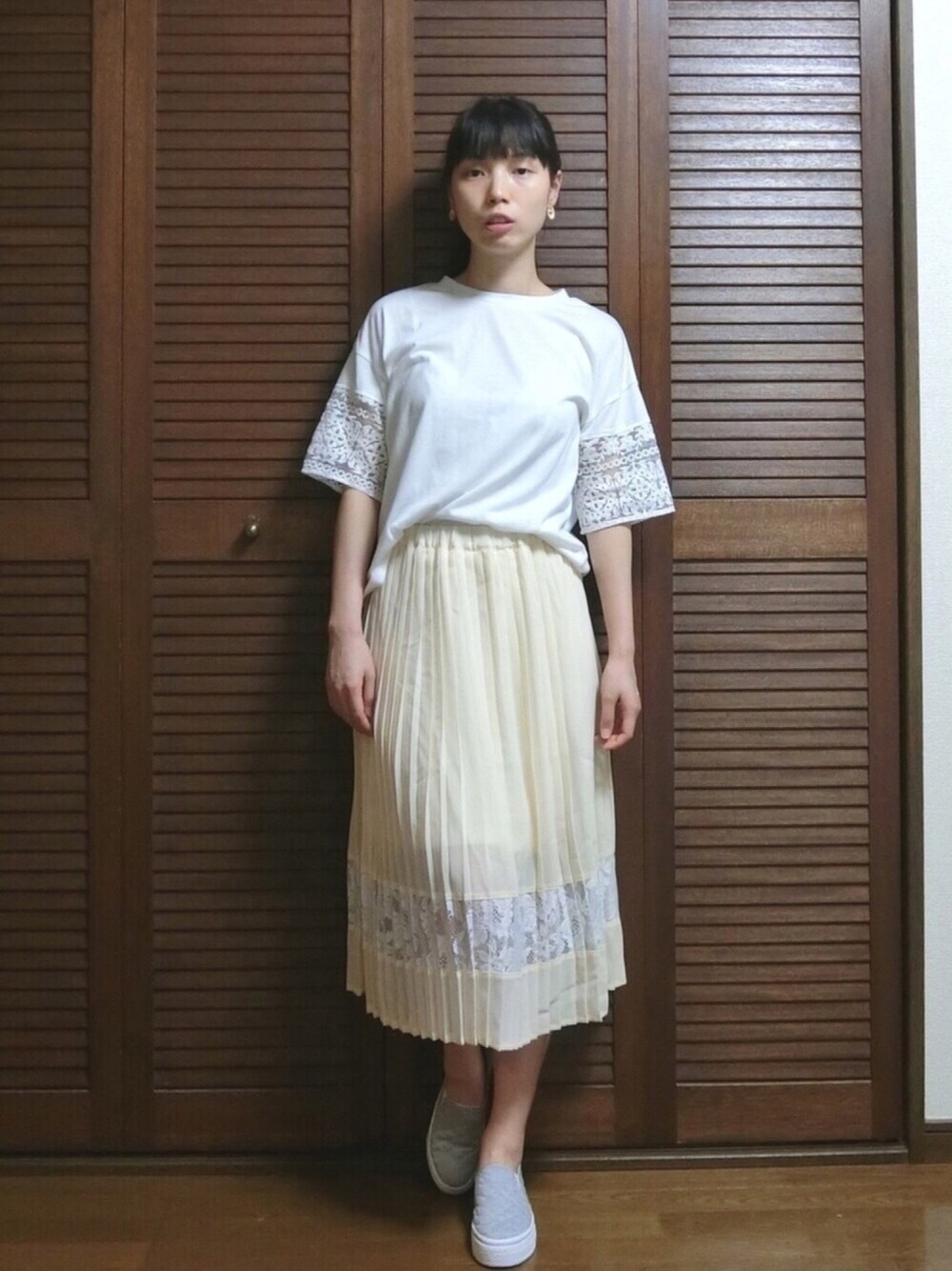 全然同じスカートのコーデでもコメントを残しましたが、自分はかなりやっちゃったので、こっちにも書きます。 このスカート、ホワイトと表示していますが、色味が真っ白ではありません、ちょっと淡いサーモンピンク(?)がかかってます。 ホワイトを検討している方は必ずゾゾさんの商品ページでモデルさんが着ているスタジオで撮った写真を確認してくださいねー