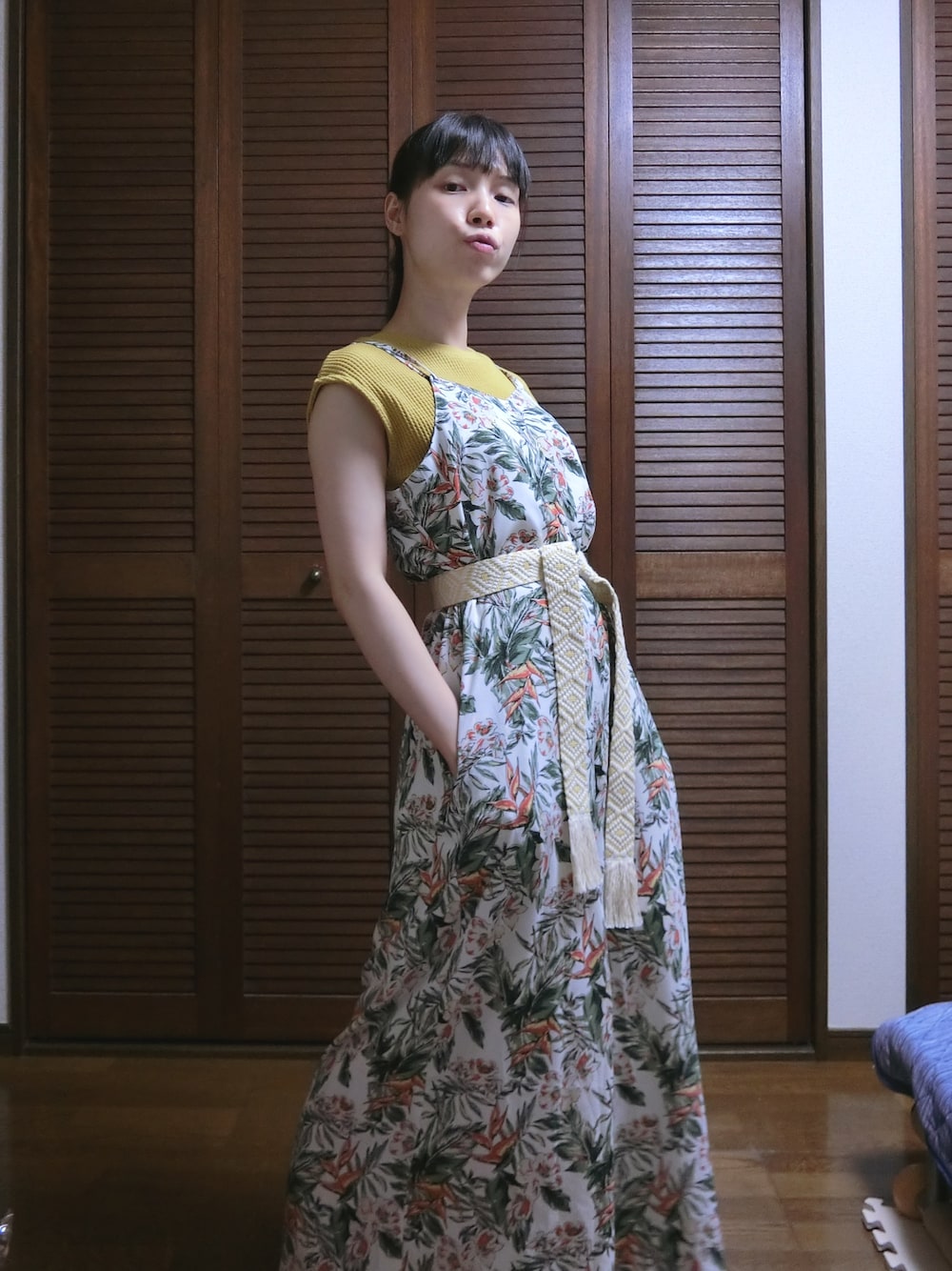 KBFのサロペットは同僚からいただいたもので、トップスは5月頃にセールで買ったものですねー このサロペットは脇周りの形が体にフィットしてますので、袖があるものより袖がないものがぐっと格好よく見えます。 同じトップスはほかにホワイトとベージュも持っていますが、一番合うのはホワイトじゃなくて写真に写っているYELLOWです。おそらくサロペット自体のベース色がホワイトなので、ホワイトのトップスだと地味さが出てしまうのが原因だと思います。 あと腰まりはストーンとしていますので、遊びにいく感が半端じゃないっす、旅行とか海に行きたくなりますwww なので、今回は編みベルトをつけてみました。 つけたほうがスタイル良く見えるってほめてもらえましたー あとでベルトなしの写真もアップしますね!