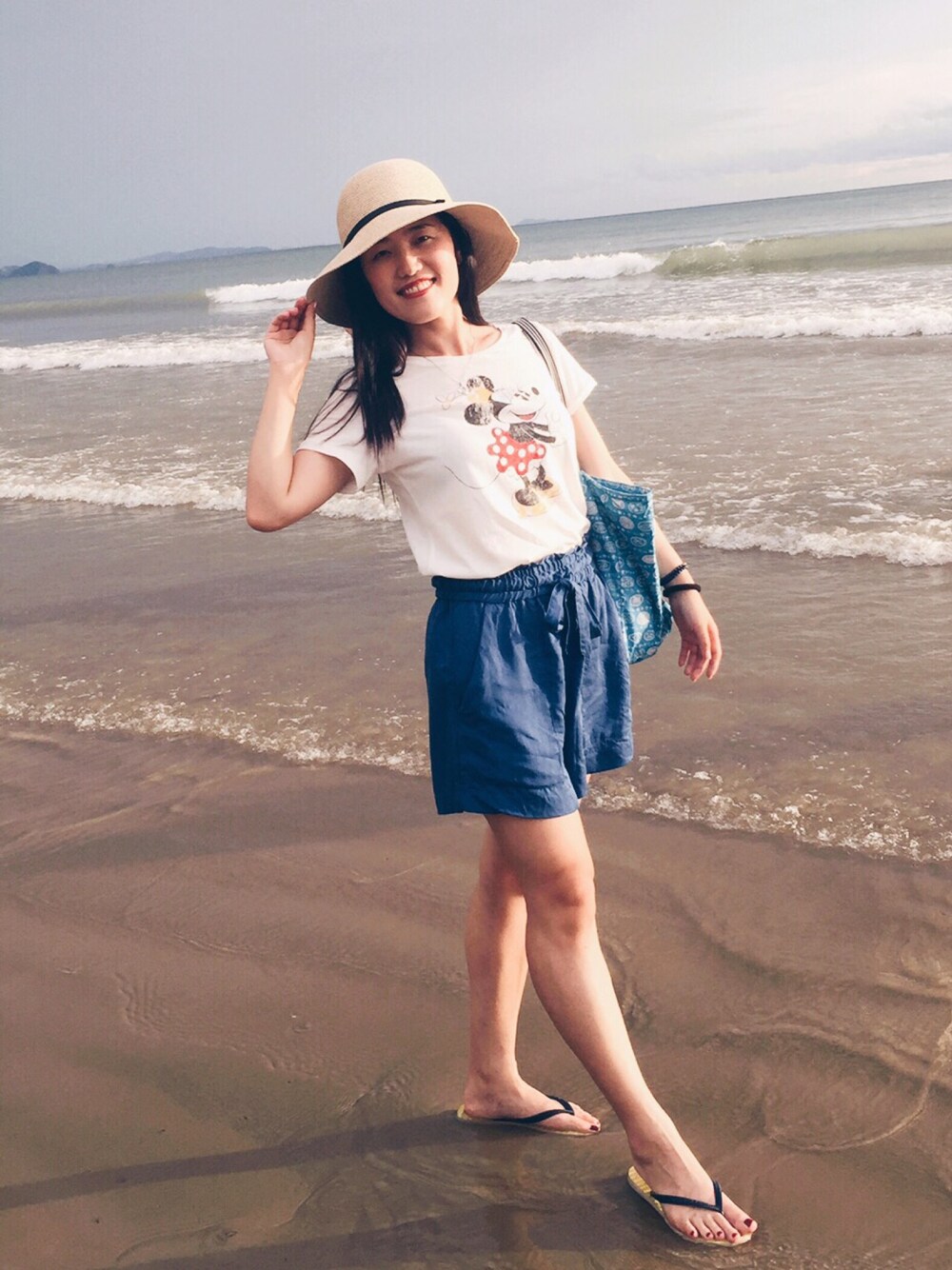 休闲短袖T恤+高腰短裤~挨妹纸必备单品哈~高腰短裤可以拉高腰线,卡通印花显得比较活泼休闲~海边搭配遮阳帽,怎么拍都很美喔!