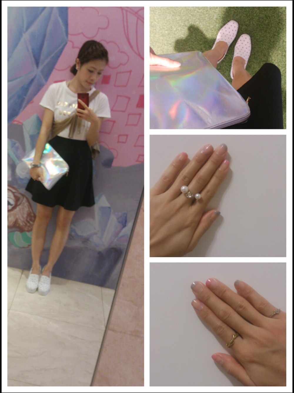 今日のわたし☆白x黒x白☆リーファーのTシャツとポーチ、そして、iのパンプスもセールにゲットしたものですよ(*^^*)連休だからセルフネイルもできました! 今日は素敵なカフェで友達とアフタヌーンティーしました ♡♥♡楽しかったわ♡