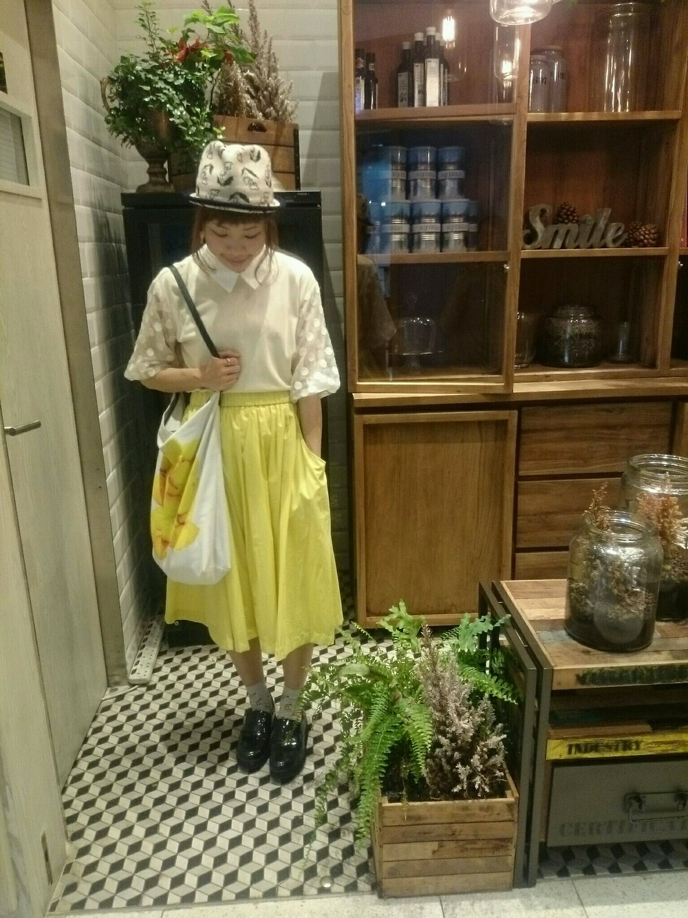 Carolina glaser × mahoさんのトップスやっと届いた💖嬉しい✨2ways だからスカートとパンツにも合わせるよ\(^o^)/ 今日の靴下の柄→バナナ🍌 トートバッグの柄→ レモン😂 お腹が空いた(笑)