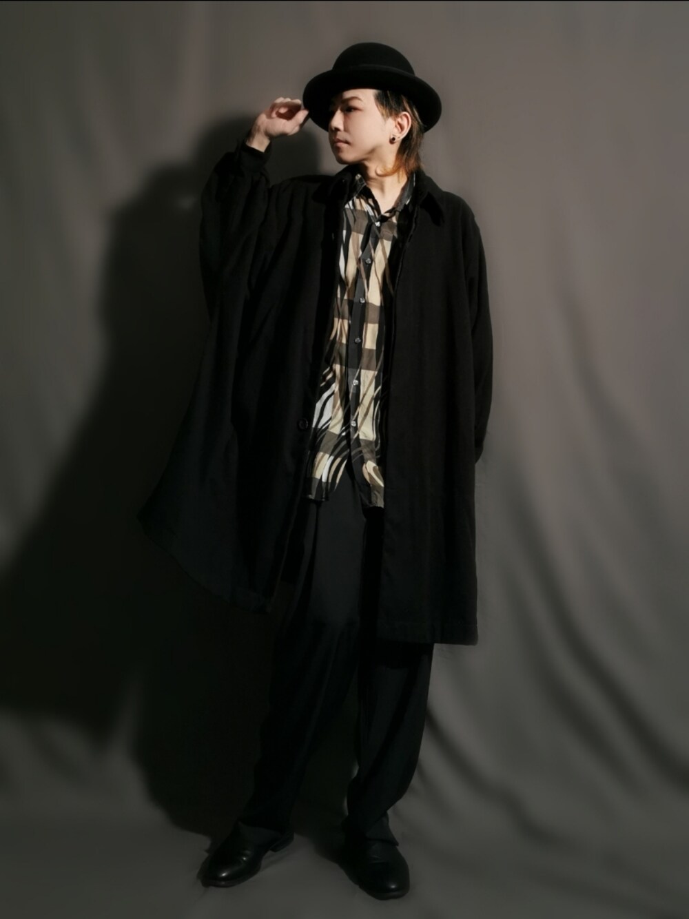 古着で見つけたクセ強めの柄シャツ 真っ黒の中バシッと際立ち良い感じ。 堅くなりがちな黒コーデを緩く楽しく
