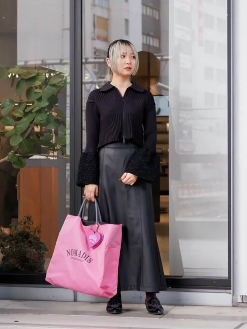 フリーサイズ バッグは大容量かつ軽量で使いやすいです! オールブラックコーデ×ピンク小物でバッグを差し色に。