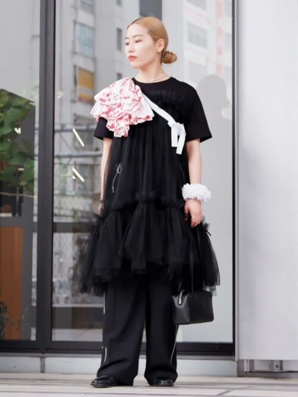 別注カラーの半袖ワンピース チュールですが、ブラックカラーなので甘さ控えめに着用できます パンツで合わせるのがオススメです 。 【着用サイズ】 トップス M ボトムス S