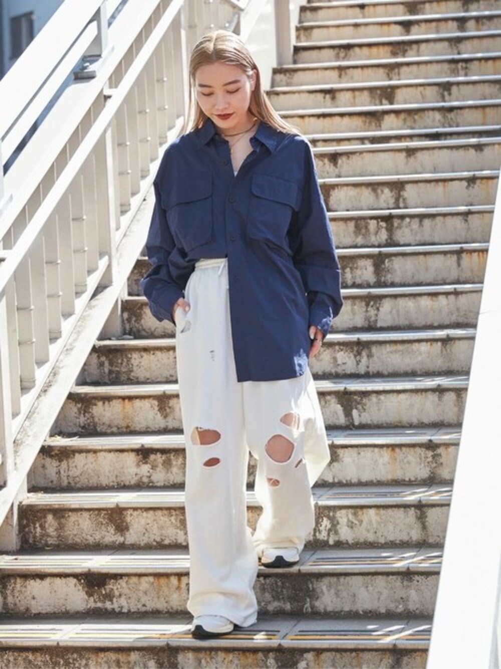 メンズのアイテムですが 女性の方でもオーバーめに着ると可愛いです クラッシュデニムもサイズによってユニセックスで着用可能です 【着用サイズ】 トップス M ボトムス M
