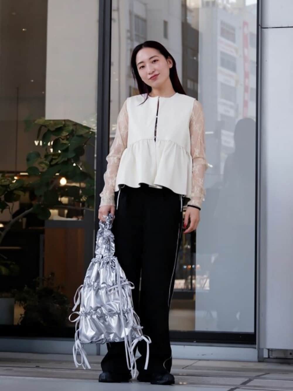 カジュアルな印象になりやすいベストスタイリングですが、レザー素材×ホワイトで女性らしさをplus メタリックカラーのナプザックもトレンド要素たっぷりでおすすめです! 【着用サイズ】 ベスト F インナー F ボトムス S