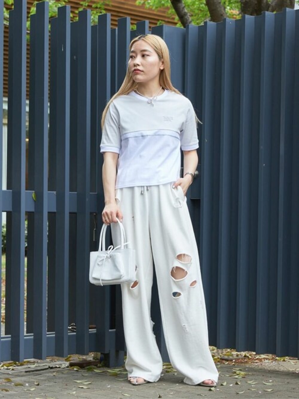 コンパクトめのTシャツに ダボダボのスウェットパンツで 【着用サイズ】 トップス F ボトム M
