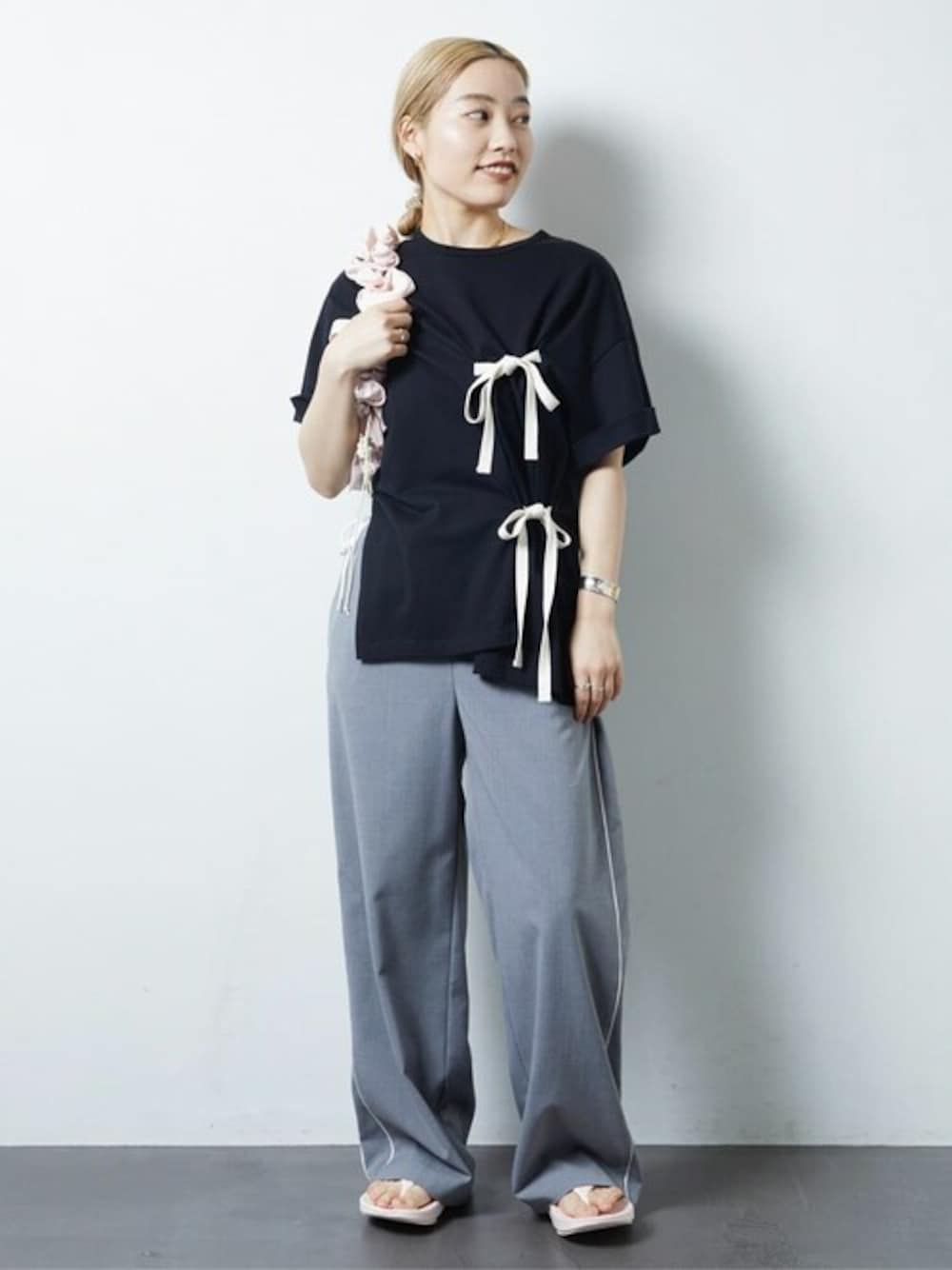 自由自在にその日の気分で結べるリボントップス♡ 垂らしたままでも◎ 【着用サイズ】 トップス F ボトムス M