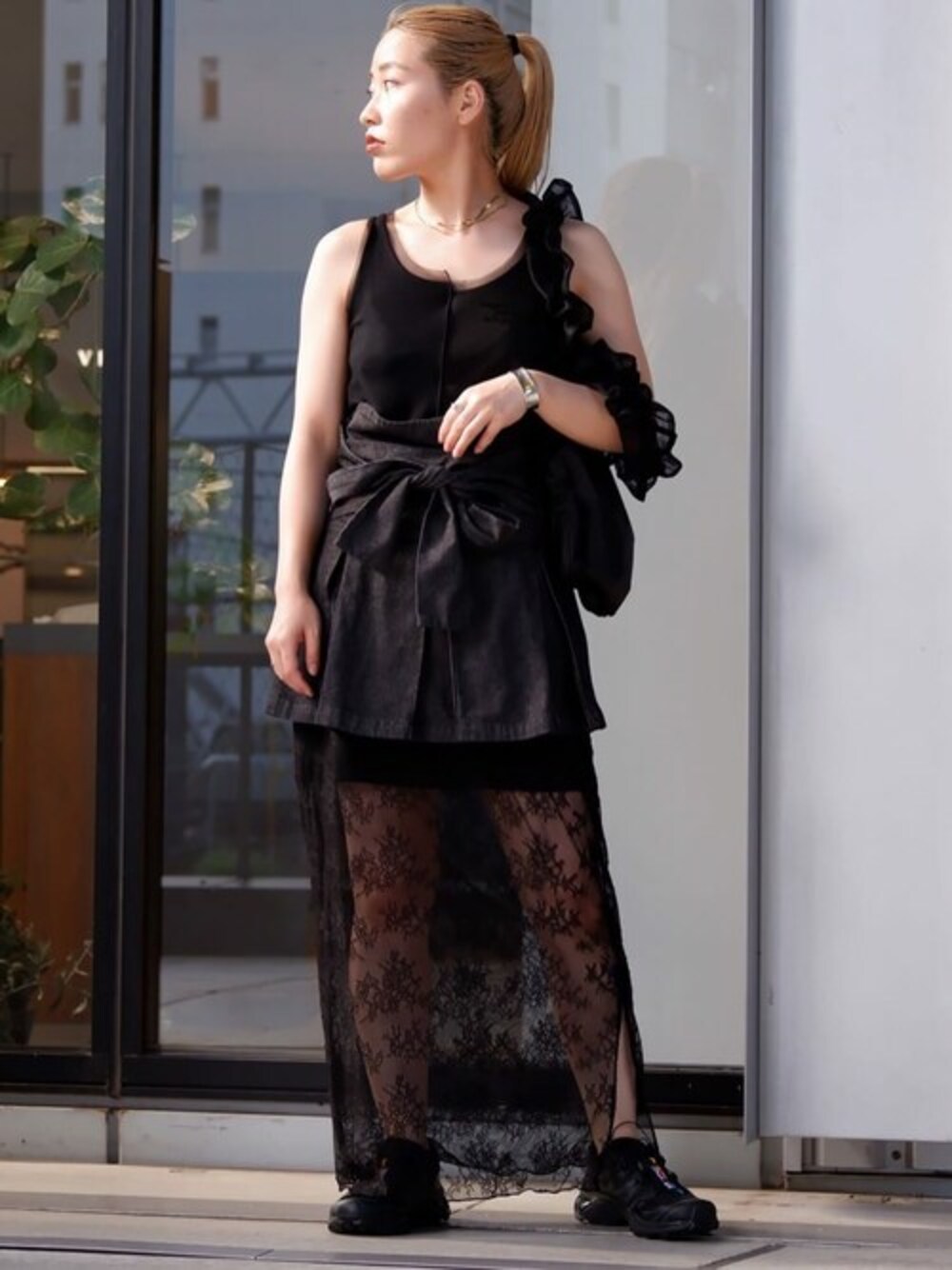 スカート×スカートのレイヤードスタイル レースのスカートはデニムなどにも合わせやすいアイテムです 【着用サイズ】 タンクトップ F スカート   F ベスト    F