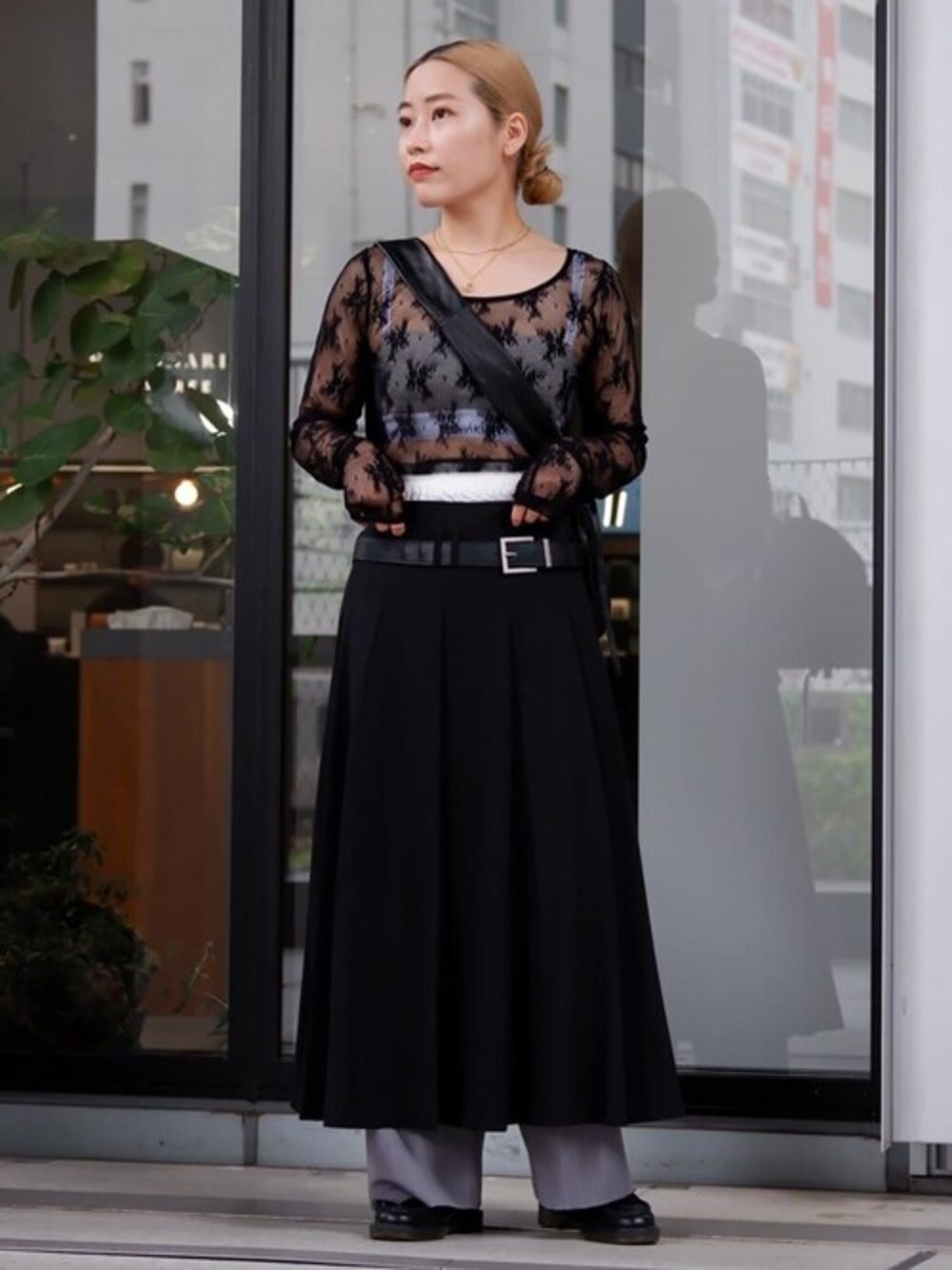 レイヤードスタイル 上はピッタリ、下はユルっと メリハリあるコーデになります トップスは1枚でも、インナーでも使えます 【着用サイズ】 トップス F インナー S スカート S ボトムス S