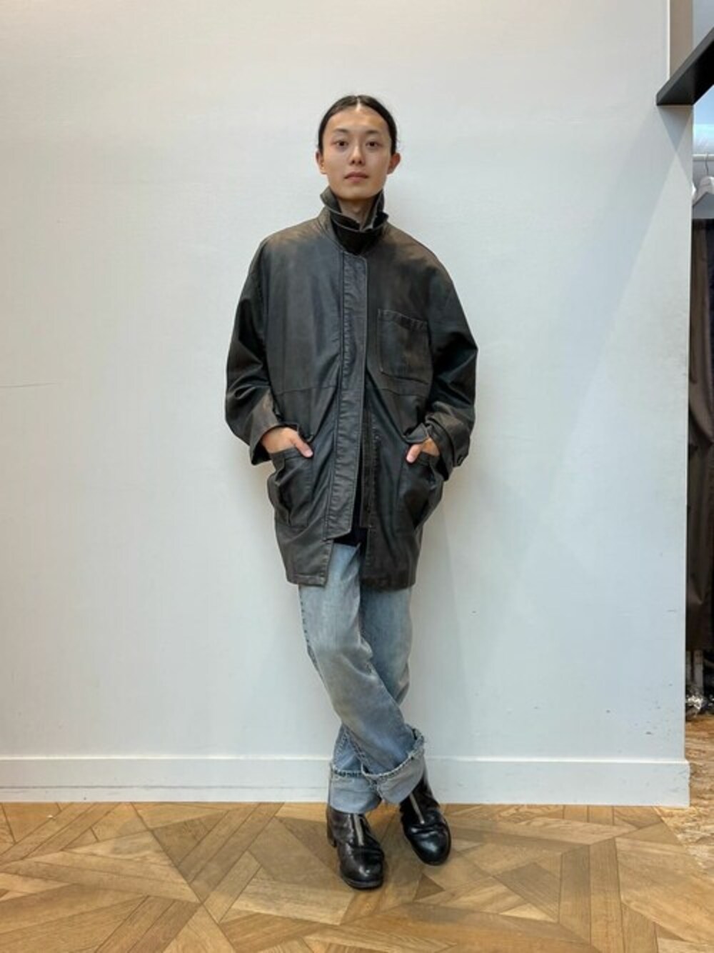 Firsthand(Firsthand HEAD OFFICE)のブルゾン「Firsthand/ファーストハンド クラッシュフェイクレザーブルゾン / ユニセックスサイズ展開」を使ったコーディネート