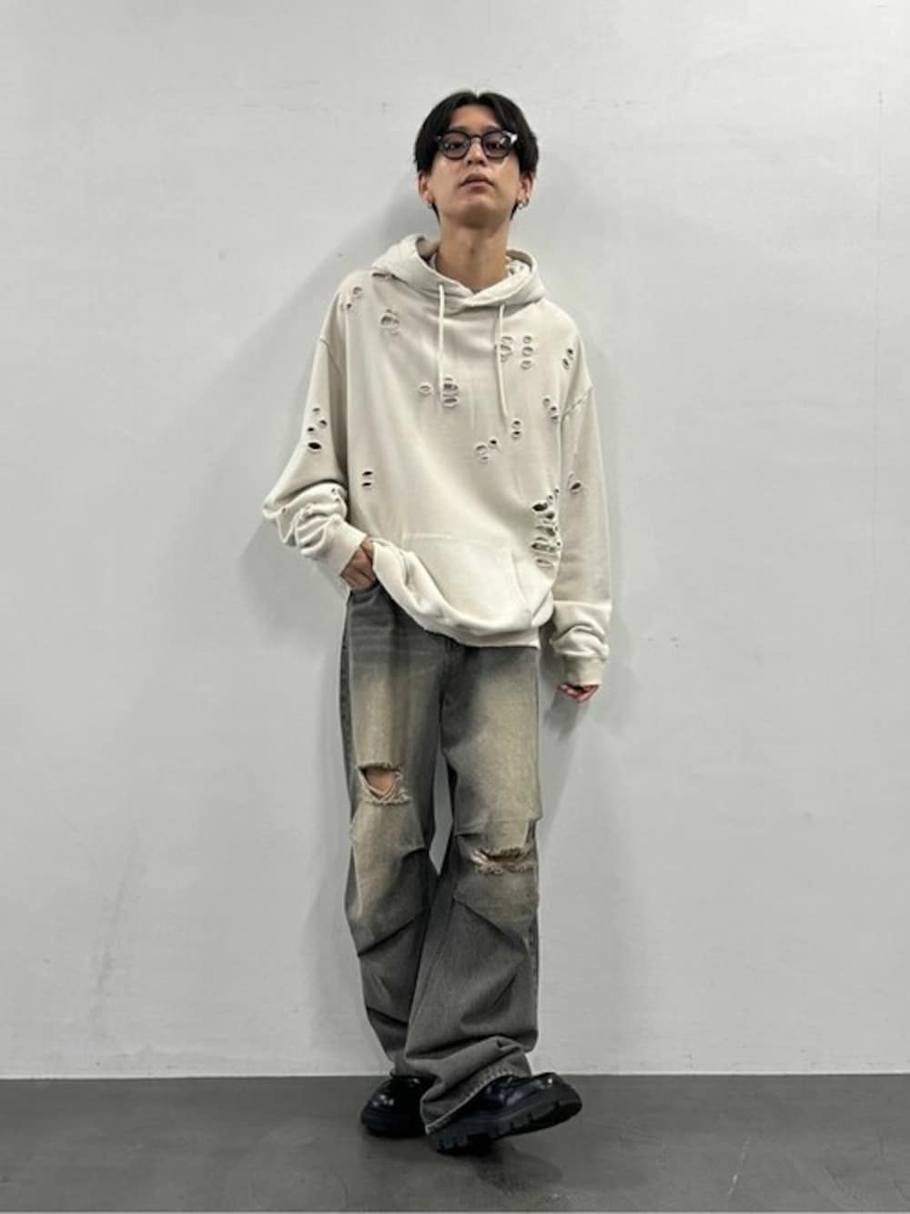 ダメージパーカーとデニムでグランジファッション。 着用サイズ パーカー:L