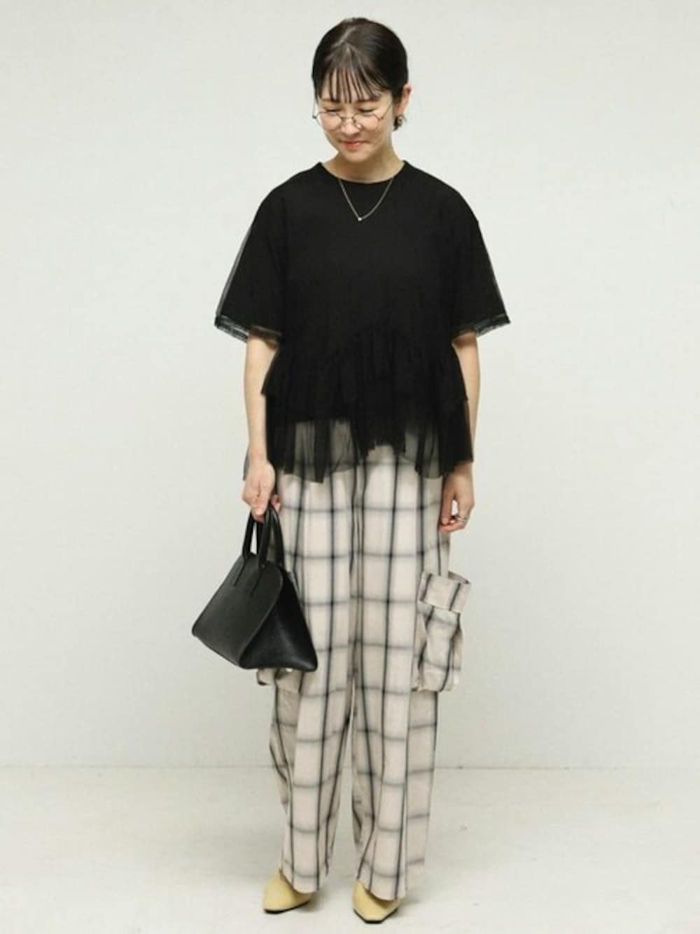 チュールのシアー感とスクエア型に入ったギャザーが1枚で主役級のカットソーと 秋ムード漂いながらも今すぐ着れる オンブレーチェックイージーパンツのスタイリング パンツはイージーながら前の開き見せステッチが綺麗に見せてくれるのと大きなパッチポケットがポイントです♪