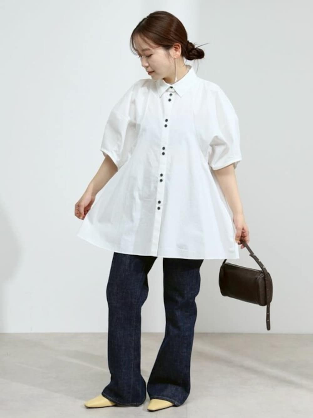 バルーン袖がとても可愛いシャツを使ったコーデです♪ カジュアルにもキレイ目にも合わせられる万能なシャツ。 フロントのボタンがポイントになっています(^-^) (腰回りが隠れるのもとてもありがたい。。。)