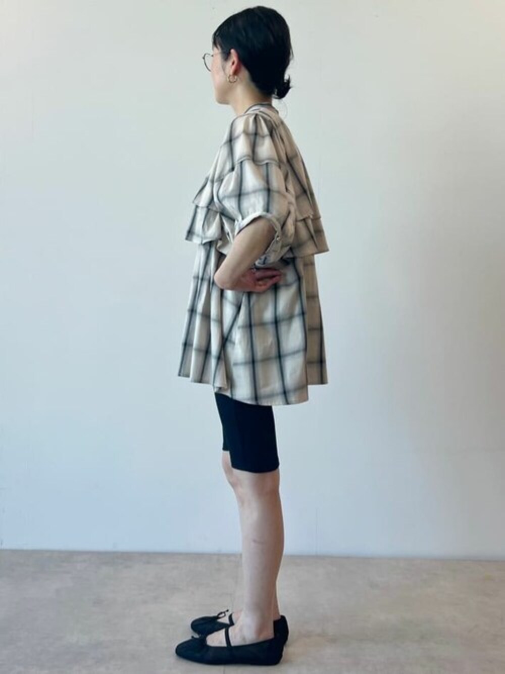 サラリとしたシャツ素材のオンブレーチェックシャツにバイカーパンツを合わせて綺麗めカジュアルスタイリング シャツは秋ムード漂うオンブレチェック柄ながら涼しいシャツ素材と5分袖丈がバルーンシルエットになっているので風通しが良く今から来て頂けるトップスです。 1番上と袖口にさりげなく光る金釦とティアードになったヨークデザインで カジュアルになりすぎず大人っぽく着て頂けるシャツブラウスです♪