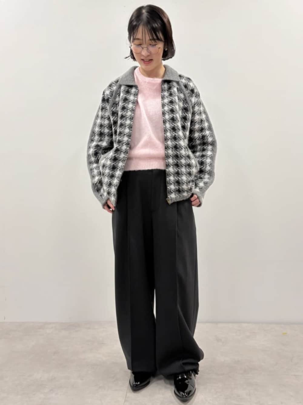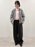 ウールが80%入って軽いのに暖かいガンクラブチェックニットブルゾンと アルパカ入りの前後バイカラーがおしゃれなニットを合わせた綺麗めスタイリング パンツはダンボール素材でもちもちで着心地抜群ながらつまみピンタックデザインで綺麗めに見えます 旅行に最適なスタイリングです