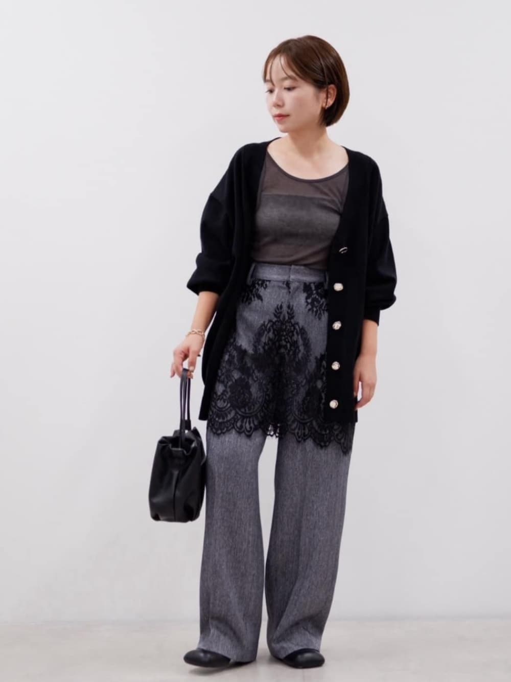 モノトーンに大人っぽくまとめたコーディネートです。レースアイテムを混ぜることでシンプルすぎないトレンド感もプラスしました。
