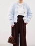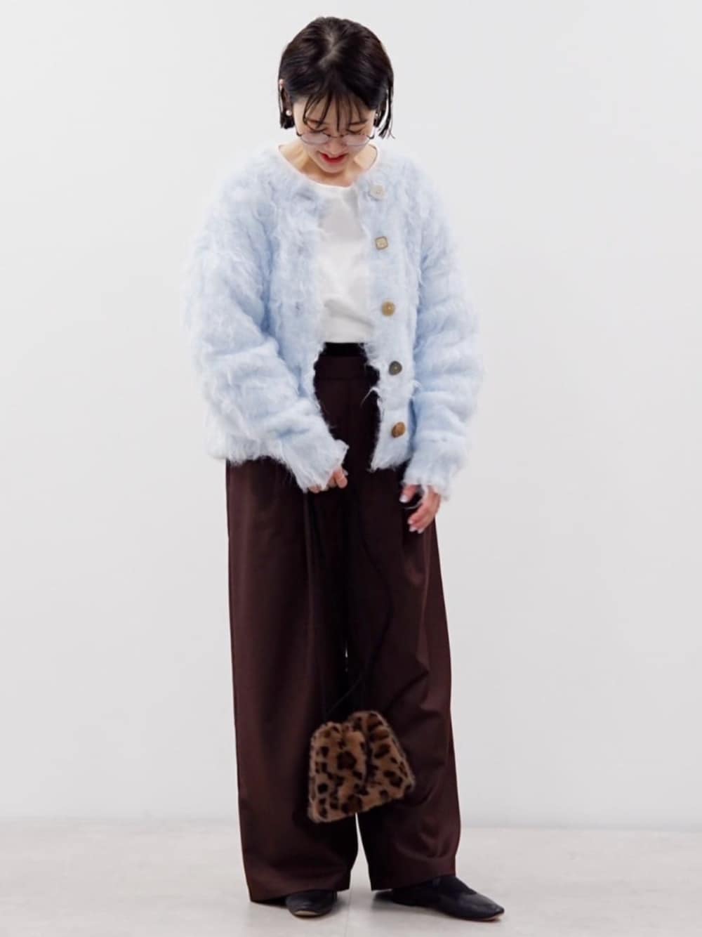フワフワな毛先と全て違う釦がキャッチーで女子っぽいシャギーニット! 甘くなり過ぎないようにベロアダブルウエストスラックスブラウンで締めました🤎 フワフワのレオパードのフェイクファーミニキンチャクバッグと チョコミントみたいなスタイリング