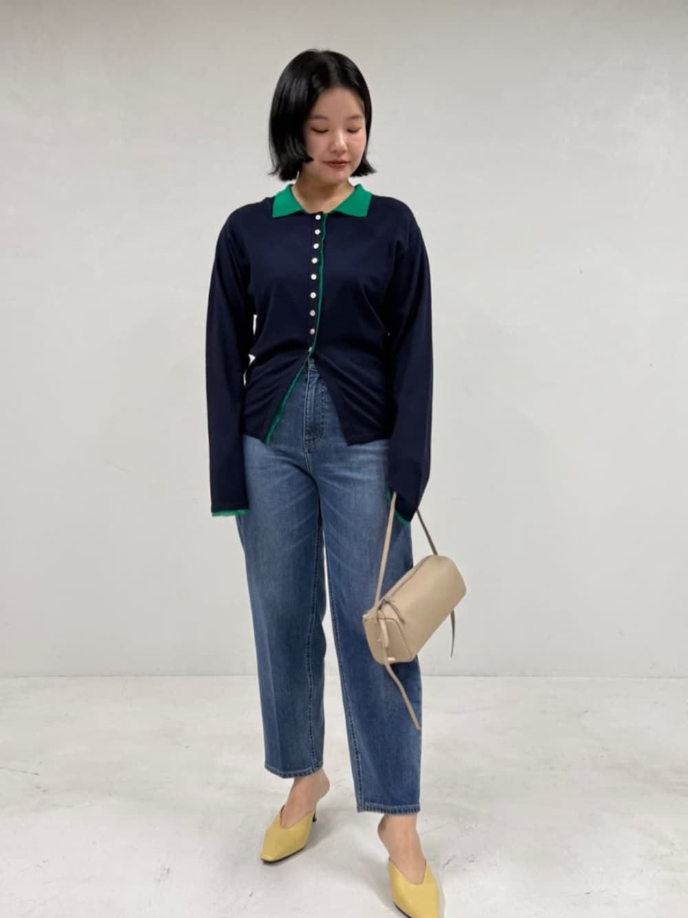 シルエットが綺麗なポロニット👕 襟と前立てが配色になった一枚で主役になるトップスです。 裾のスリットもポイントでウエストがくびれて見える美シルエット✨