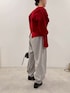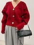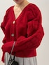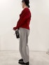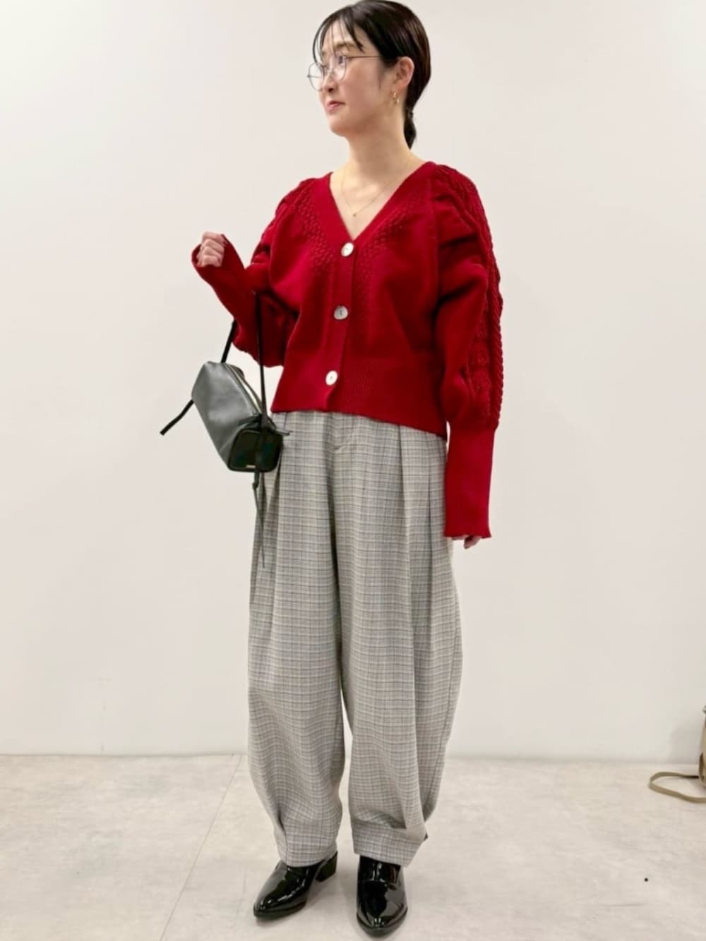 もちっとした着心地のニットカーディガン 袖に入ったケーブルとアイレット柄がアクセントに、袖に入ったタックで立体的な袖が こなれた雰囲気を出してくれます 色と形の違う貝ボタンが交互に付いているのも さりげないポイントになっていて 1枚で顔周りが映えるデザインニットです シャリみのある、今年の春夏注目の カラミチェック素材のカーヴィーパンツを合わせて、トレンド感がありながら 大人スタイリングに仕上げました