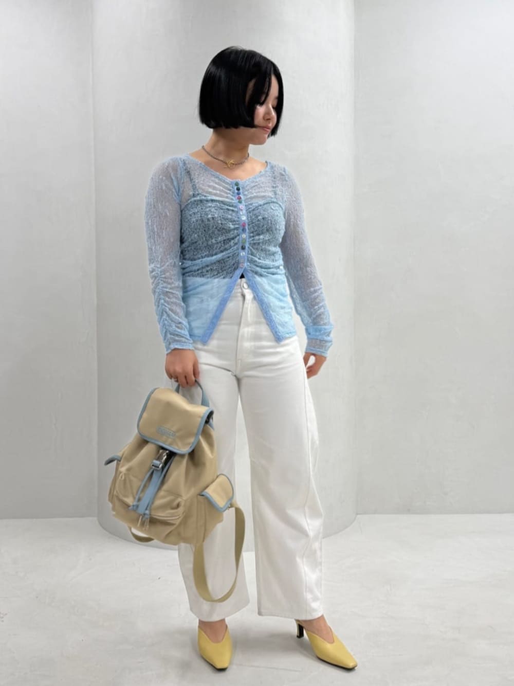 レースのシアー感が華やかなトップス✨ ミニリュックの配色とトップスの色を揃えて春らしいコーディネートに仕上げました☘️