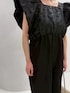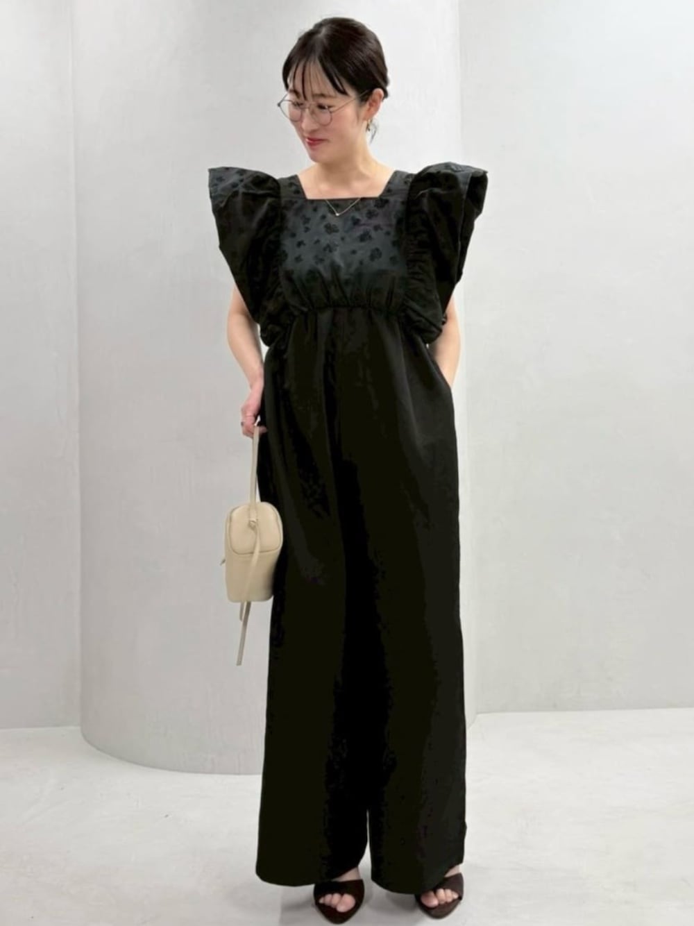 オケージョンの場面が増えてくるこれからの季節に向けた シアージャカードと無地素材をドッキングさせたオールインワン 1枚でスタイリングしてるかのようなデザインと、足を長くスタイル良く見せてくれながらもゴム仕様でストレスフリーなのがこだわりポイントです またスクエアネックとVネック 前後2wayで着れるので 肌寒い時や肌を見せたくない時には Vネックを前にしてシアーカットソーを中にレイヤードしても、雰囲気が変わって可愛いです♪ トレンドの横長小さめバッグと合わせて パーティにもいける綺麗目スタイリングで 着てみました オケージョンの場で周りのみんなと 違った着こなしをしたい方にオススメです