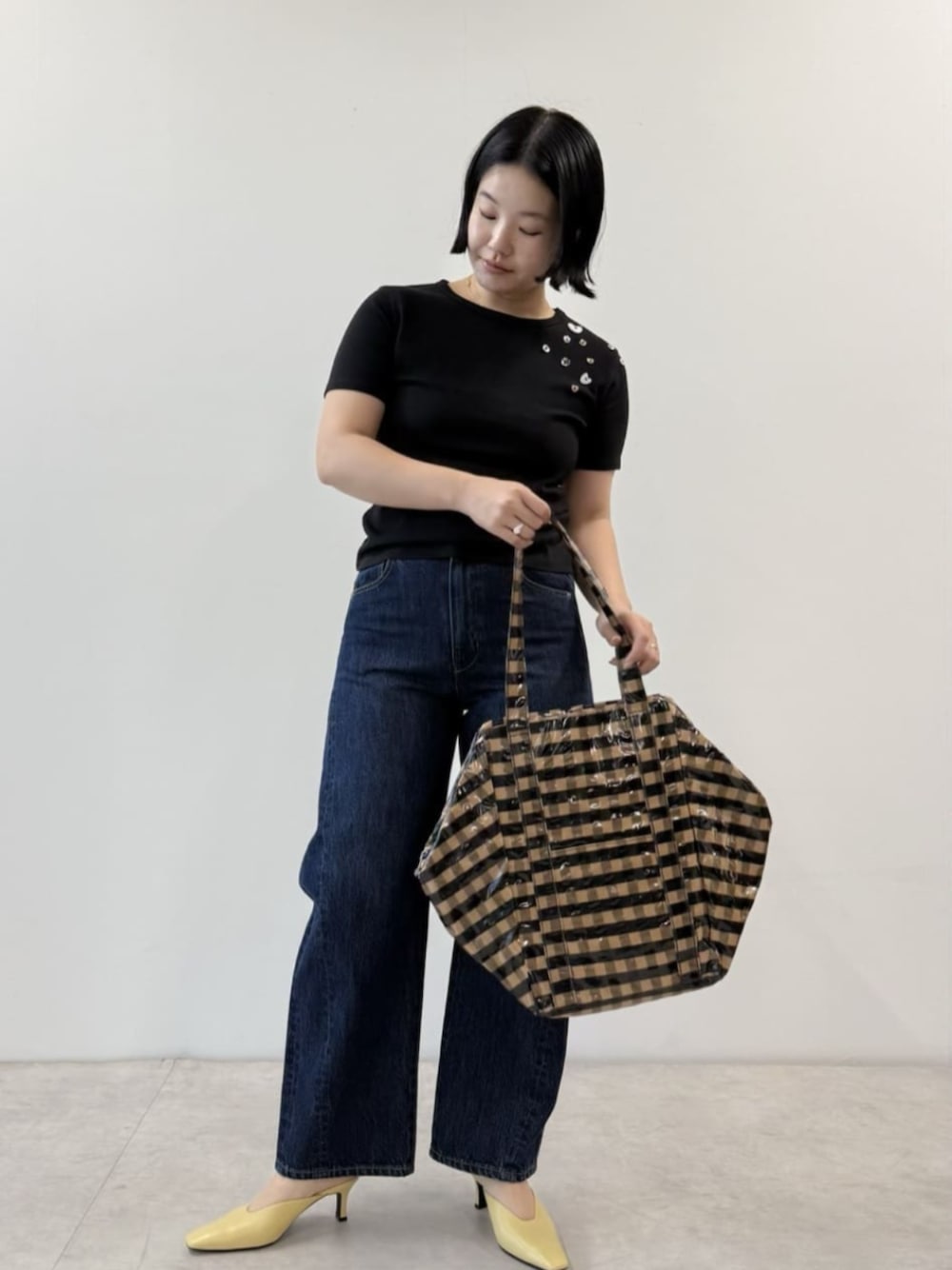 Tシャツにデニムの簡単なコーディネートですが、それぞれが少し気の利いたポイントがあって、ただのカジュアルにならずに◎ 左肩に様々なボタンが散りばめられた着映えTは色違いでも揃えたい!