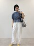 今年注目のシャーリングディテールをあしらったブラウスを主役にコーディネートを組みました◎この色だけデニム素材ですが、少し透け感があるデニムなのでとっても軽くて暑い夏も着られそうです✨バッグと色味を合わせて、素材を際立たせました!