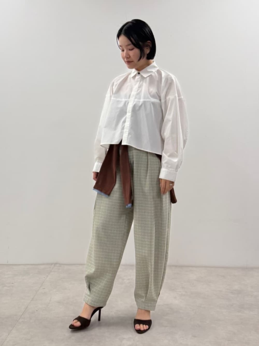 ブラウンを差し色にした春コーデ☘️ ベーシックな印象のシャツですが立体的な切替デザインで一癖あり◎シンプルなコーデに映えます✨