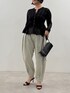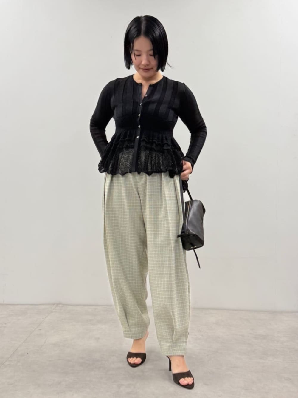 ホールガーメントのニットはタイトなシルエットですが縫い目がなく伸縮性がかなりあるのでとても着心地が良いです◎ ボタンを少し開けて着ると首元もスッキリな印象に✨ パンツはMサイズ着用しています。 ヒールで合わせるとスッキリしますが、あえてペタンコで合わせて足元にボリュームを持たせても◎