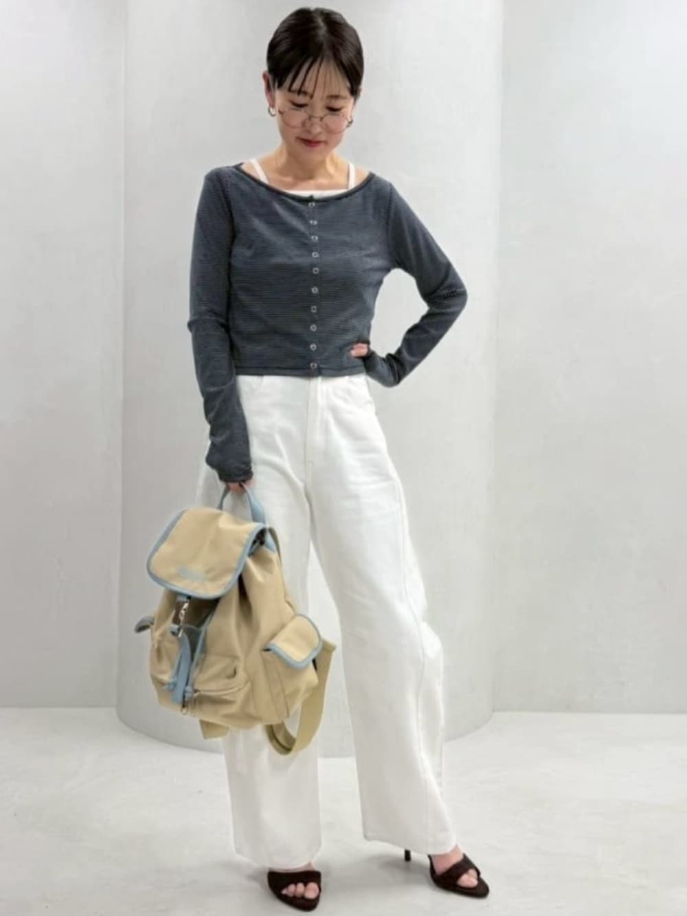 重ねるだけで今っぽいスタイリングに仕上がる レイヤードセットアップ キャミはしっかりとハリ感ある生地で カーディガンがしっとり柔らか素材で 着心地が本当に良いです 私みたいにキャミの上にカーデを重ねたり カーデの上にキャミをレイヤードしたり もちろん別々に使えて 着こなしが広がるアイテムです ハートスタッズデニムパンツのオフと OUTDOOR PRODAUCTS別注ミニリュックで 爽やか大人カジュアルスタイリングで