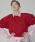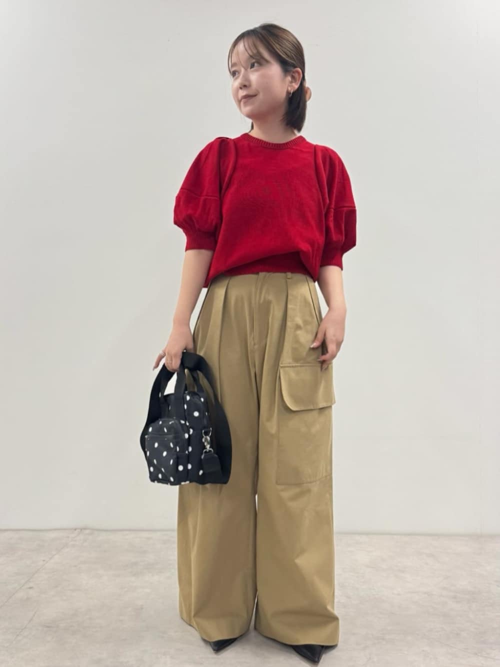 立体感が可愛いパフスリーブトップスです! 赤の発色が良いのでベーシックなベージュのワイドパンツと合わせました。