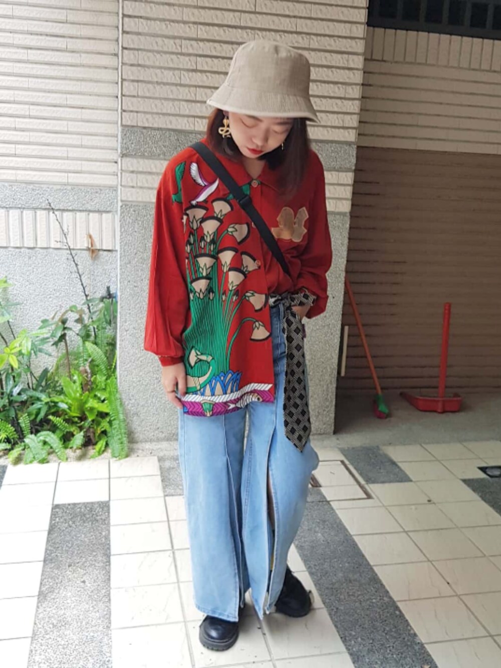 レッド系のシャツ/ブラウスを着用したレディースの冬コーディネートの1枚目の写真