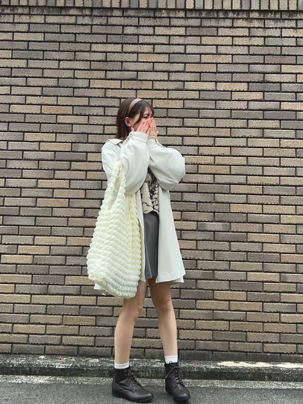 GRL、SHEIN、Honeysのプチプラコーデ GRL:トレンチコート SHEIN:トップスのニット、ポップコーンバッグ Honeys:ミニスカート、ショート丈ブーツ ホワイト・ベージュ・ブラウン系で淡色っぽく🐻🤍 トレンチコートで春っぽさも、、🌸