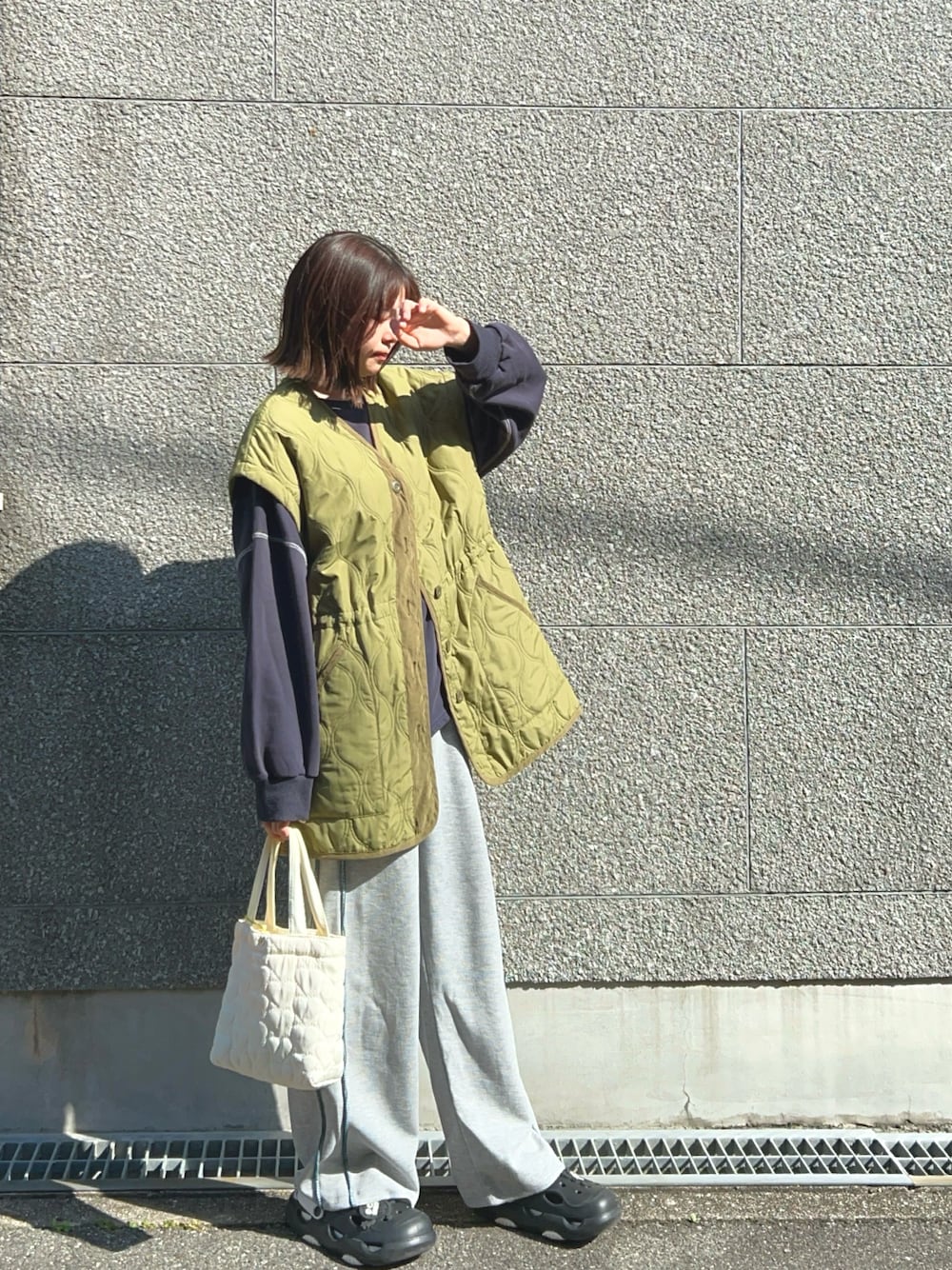 春に近づいてぽかぽか暖かい日にお散歩👣 上下ともにスウェットで動きやすいラフな格好で。 1枚だとまだ少し寒いからキルティングのアウター羽織ってみたの アウターは2wayで袖の取り外しができるからお気に入り♪