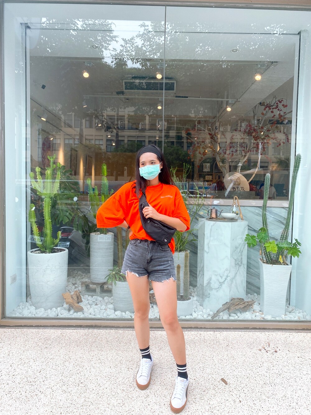 ホワイト系のスニーカー、ブラック系のボディバッグ/ウエストポーチ、ホワイト系のスニーカーを着用したレディースの秋コーディネートの1枚目の写真