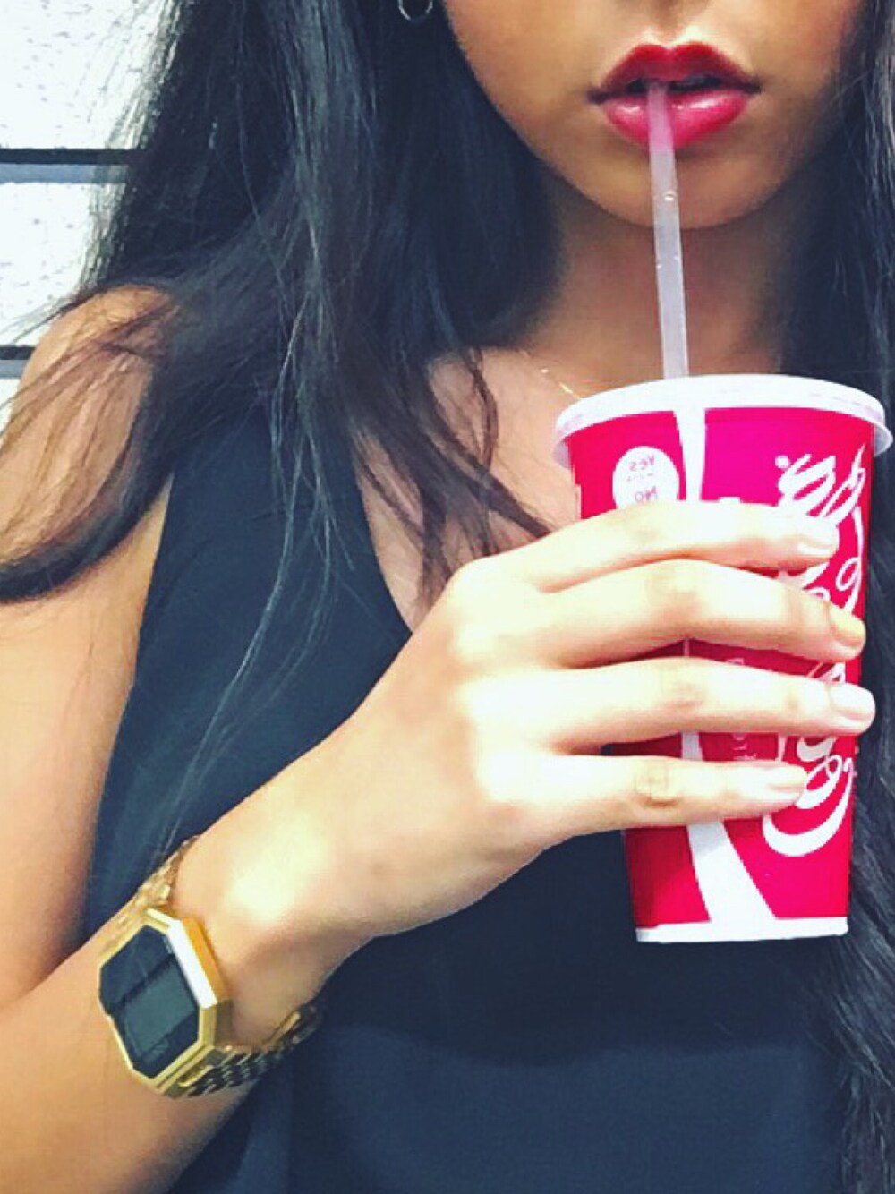 ブラック系のタンクトップを着用したレディースの夏コーディネートの1枚目の写真