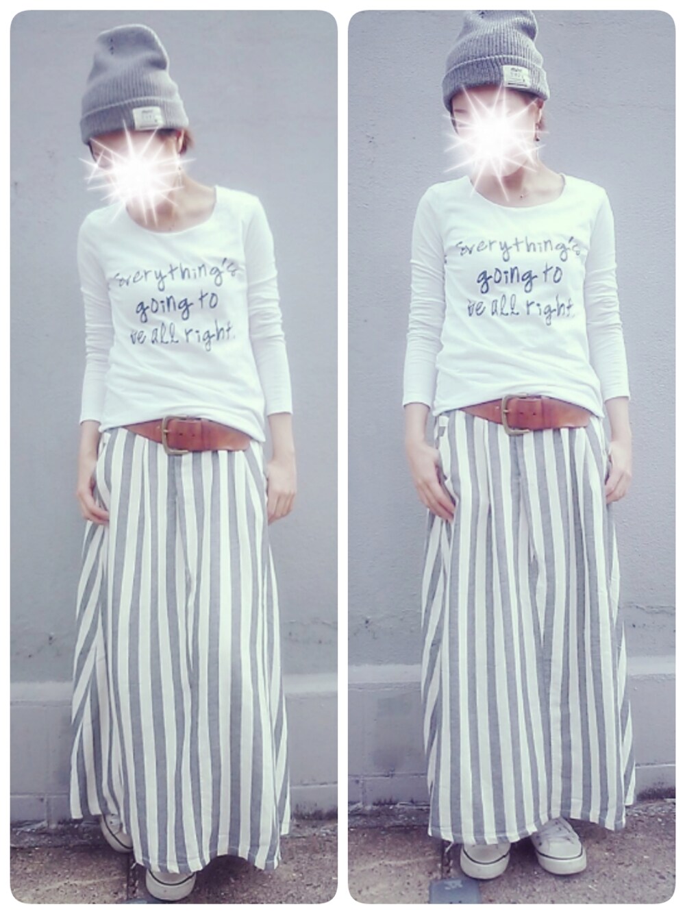 3939のスカート「ストライプマキシスカート」を使ったコーディネート