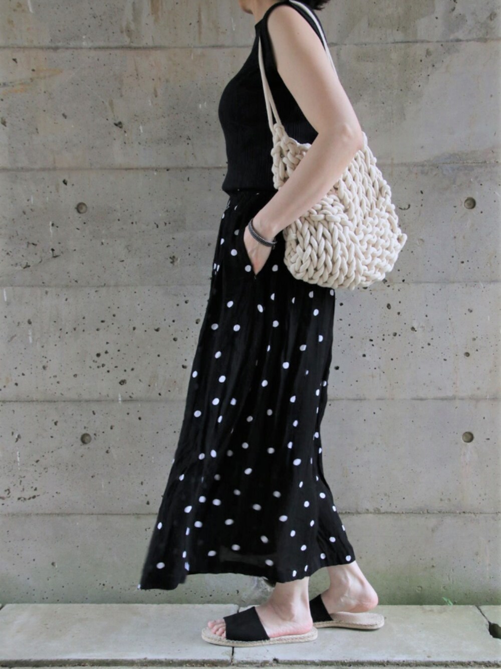 黒ベースのドット柄スカートに黒のシンプルなカットソーを選び、ワンピースのような一体感を出すことでモダンな雰囲気に ランダムリブカットソー JEANASiS ドットスカート niko and… ▼詳細 https://fitting.tokyo/2021/05/16/