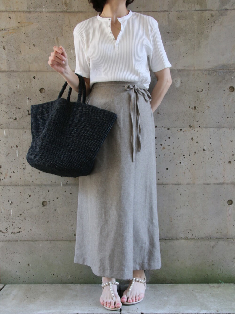 きちんと見えトップスなら小さめサイズ ヘンリーネックカットソー JOSEPH HOMME ラップ風スカート titivate 詳細 https://fitting.tokyo/2021/06/02/