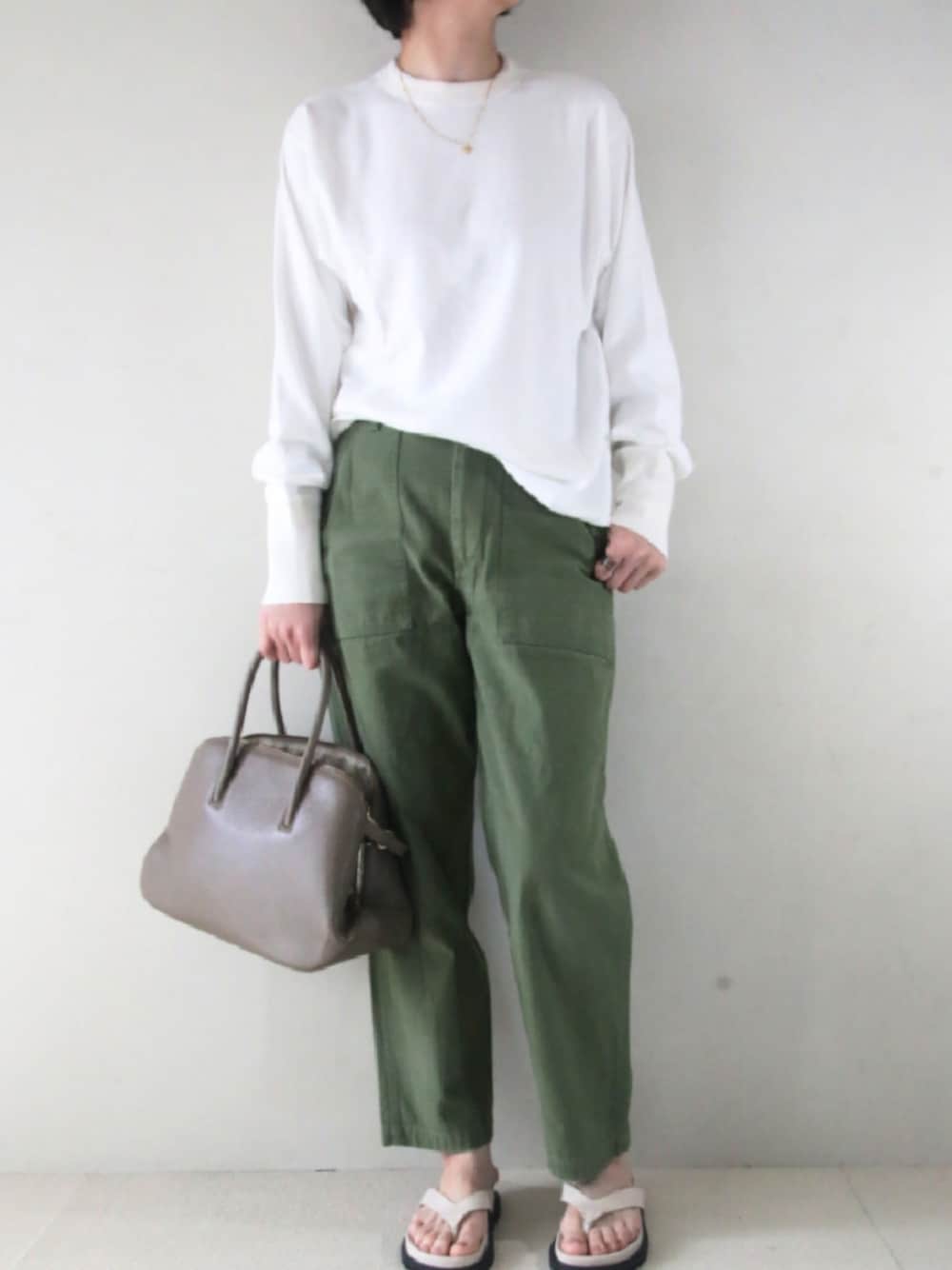 ヴィンテージの風合いを意識して作られたShinzoneのカットソー。スウェットに寄せたような薄手過ぎない素材感と、1枚でも存在感ある顔立ちがなんともいえないお洒落&こなれ感を演出。 Shinzoneの人気ベイカーパンツ。迷った日の神頼み的なパンツとしてリピーターも多くスタイリストさんからの支持もかなり高め。本格的なワークパンツのイメージを残しながら今っぽさもあるシルエットには圧巻!