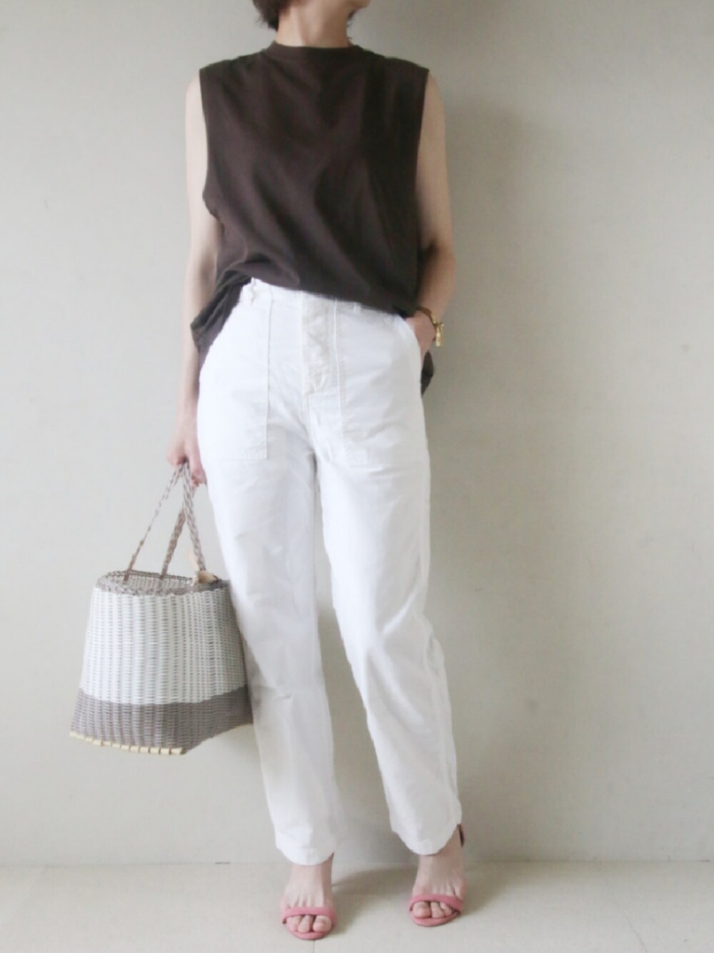 秋冬の印象が強いブラウンですが、夏コーデにも大人カラーの「ブラウン」は投入可。気を付けるべきなのは”重々しくならないようにする”こと。白やベージュで合わせると◎。軽やかで洗練されたスタイリングを作り重さを中和できます。