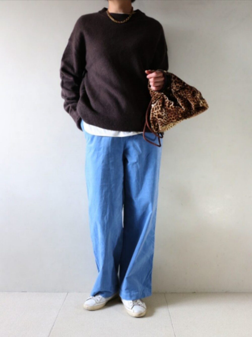 ブラウンのカシミヤ混ニットと水色ベロアパンツの組み合わせは、秋冬の装いに軽やかさを添える絶妙なカラーバランス。暖かみあるブラウンに、くすみすぎないサックスブルーが差し色として映え、重たくなりがちな季節のコーデを明るく見せてくれます。 ニットは程よいゆるさと指抜きデザインで、抜け感のある手元を演出。パンツはベロアの上品な艶が動くたびに表情を変え、デニムライクに存在感のあるスタイルに仕上げます。 詳細 https //fitting.tokyo
