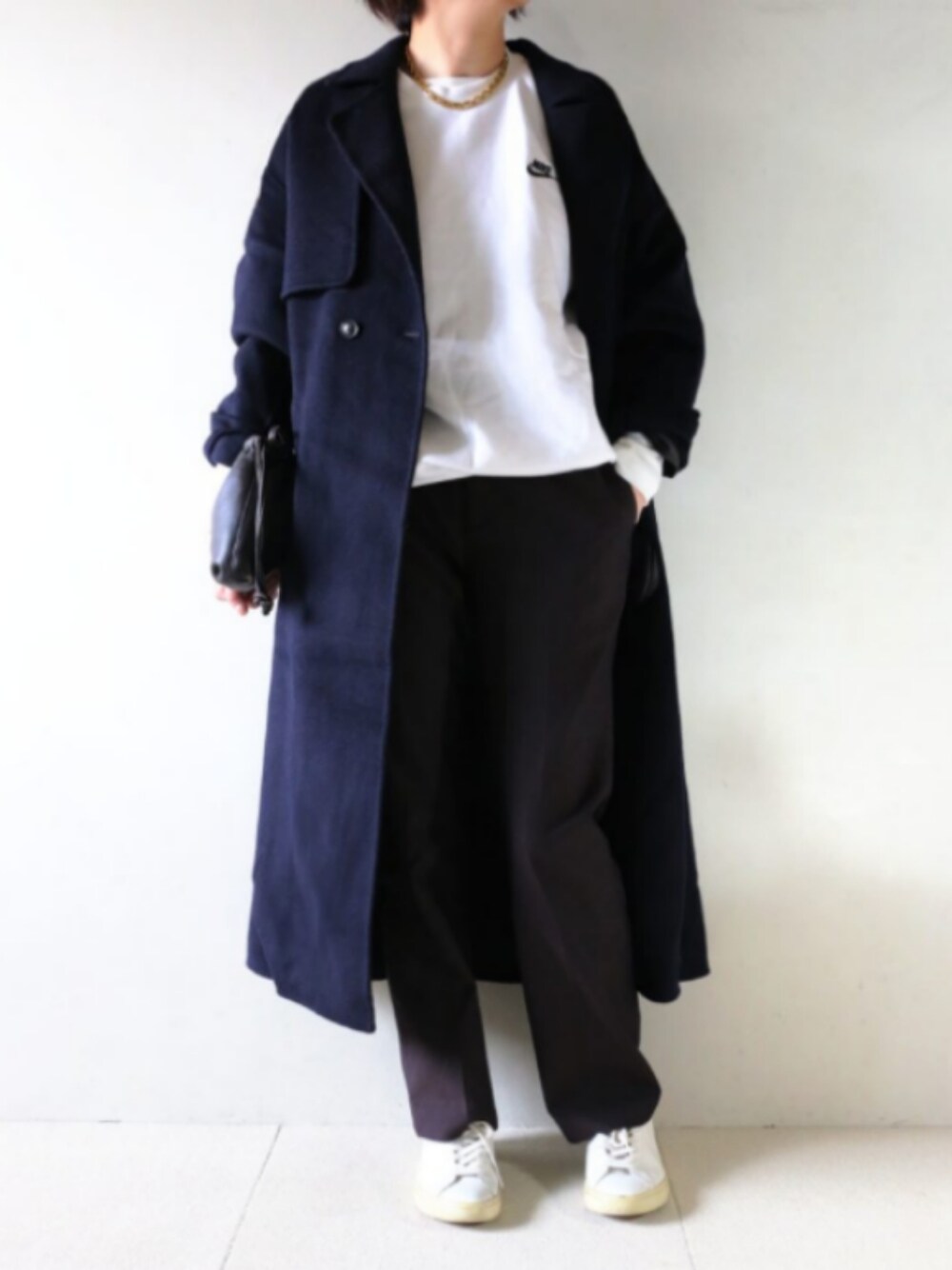 上質なウール素材を使用したグリーンレーベルリラクシングのトレンチロングコート。ほどよい厚みとしなやかな落ち感が魅力。端正なシルエットで大人の品を引き立てながら、ネイビーの深みが季節感を添えます。 インナーには白のナイキスウェット。カジュアルさを加えることでかっちりしすぎない今っぽいバランスに。 詳細 https //fitting.tokyo