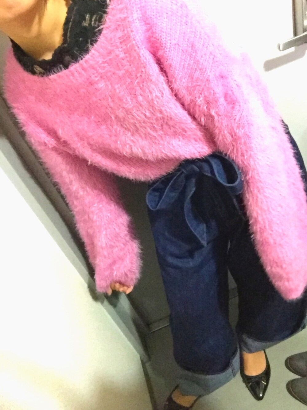 襟から靴まで収めようとしらた変なポーズになっちゃった。 カスタネのボリュームスリーブニットがラメ入りなのに肌触り良くて好き~!