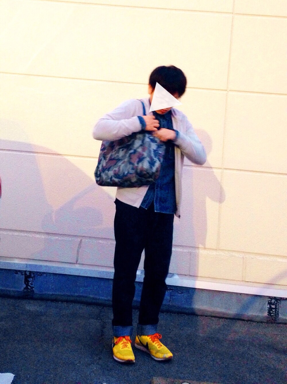 イエロー系のスニーカー、その他のエコバッグ/サブバッグを着用したメンズの秋コーディネートの1枚目の写真
