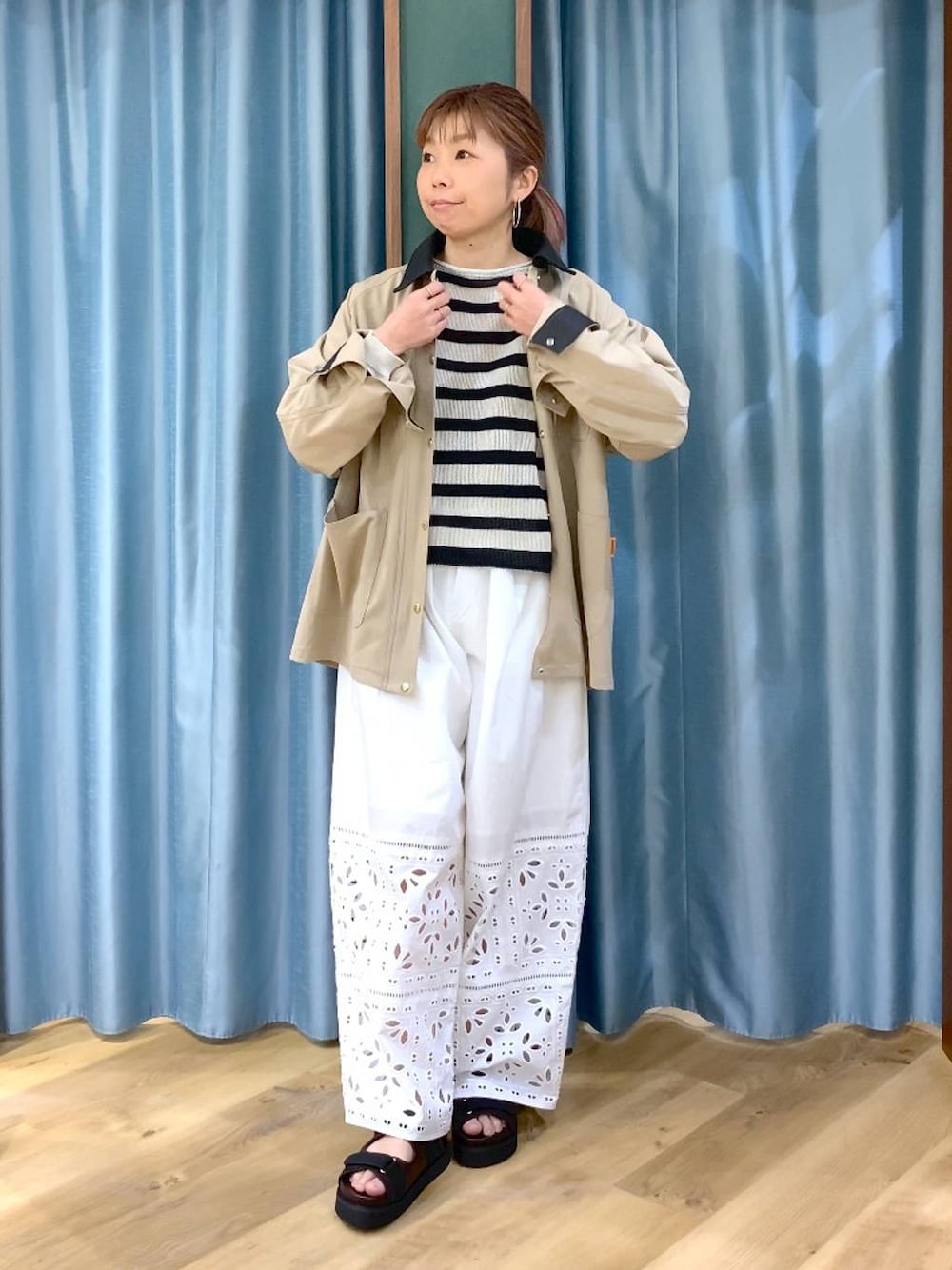 ⭐︎アウター 待ってました!ユニバーサルオーバーオールの別注カバーオール!可愛すぎる〜!羽織るだけでオシャレアイテム。カジュアル、きれいめの切れ味に! ⭐︎トップス 大人ボーダー。やや短めの着丈なのでシャツ合わせも◎透け感があるので主張しすぎないボーダーです! ※昨年発売のボーダーペーパーニットと同素材です。 お手入れ方法:ハンドウォッシャブル 和紙を極めて補足スリットさせて糸に撚り込んだ素材。 麻のようなタッチを再現し、清涼感に優れています。 ⭐︎パンツ ウエストゴムの楽ちんカーブシルエットのカットレースパンツ!オリジナルのカットワーク刺繍を施したデザイン 腰回りには裏地が付いており、透け感もカバーしてくれます! 刺繍越しに肌が見え涼しげに見えます!ハンドウォッシャブル クリーンでナチュラルな表情のコットン100%生地に、オリジナルのカットワーク刺繍を施しています。 これからどんどん スタイリングupするのでフォローお願いします! Instagramもupしていきますので ぜひ@by_sayafujiを見ていただけたら嬉しいです!