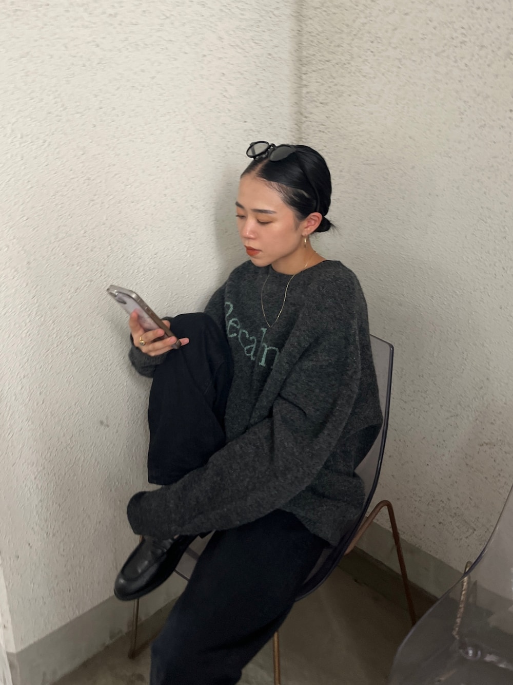 今年トレンドのロゴニット🧶♡ とってもシンプルなデザインでどんなコーデにも合わせやすい◎ オールブラックコーデで 少しモードな雰囲気でまとめました♡