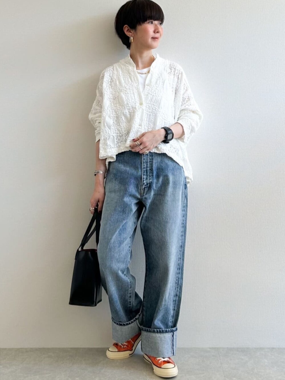 mana(JEANS FACTORY オンラインショップ)のカーディガン/ボレロ「[mizuiro ind/ミズイロインド] シアー柄編み ショート丈ニットカーディガン」を使ったコーディネート